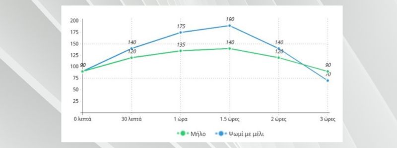 Μπορείς να δεις το γράφημα που ακολουθεί το οποίο απεικονίζει την συγκέντρωση γλυκόζης αίματος έπειτα από κατανάλωση υψηλού σε γλυκαιμικό δείκτη τροφίμου (λευκό ψωμί με μέλι) έναντι χαμηλού γλυκαιμικού δείκτη τροφίμου (πράσινο μήλο με φλούδα):