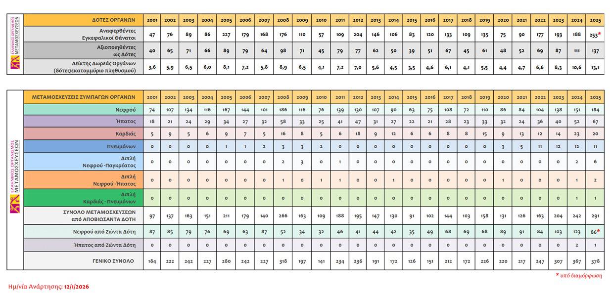 Όπως επισημαίνει, το 2019 πραγματοποιήθηκαν στην Ελλάδα 226 μεταμοσχεύσεις οργάνων, ενώ το 2025 έκλεισε με 378 μεταμοσχευτικές επεμβάσεις, δηλαδή 152 περισσότερες. Πρόκειται για αύξηση της τάξης του 67%, που συνιστά την καλύτερη επίδοση που έχει καταγραφεί ποτέ στη χώρα.
