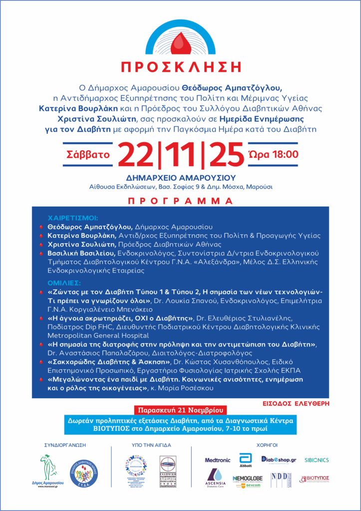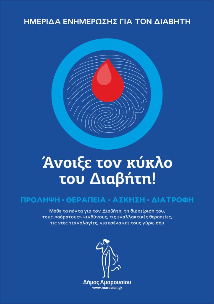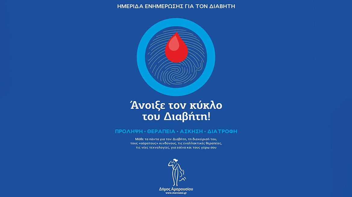 Με αφορμή την Παγκόσμια Ημέρα Διαβήτη, ο Δήμος Αμαρουσίου διοργανώνει Ημερίδα ενημέρωσης και ευαισθητοποίησης του κοινού, το Σάββατο 22 Νοεμβρίου στις 18:00.