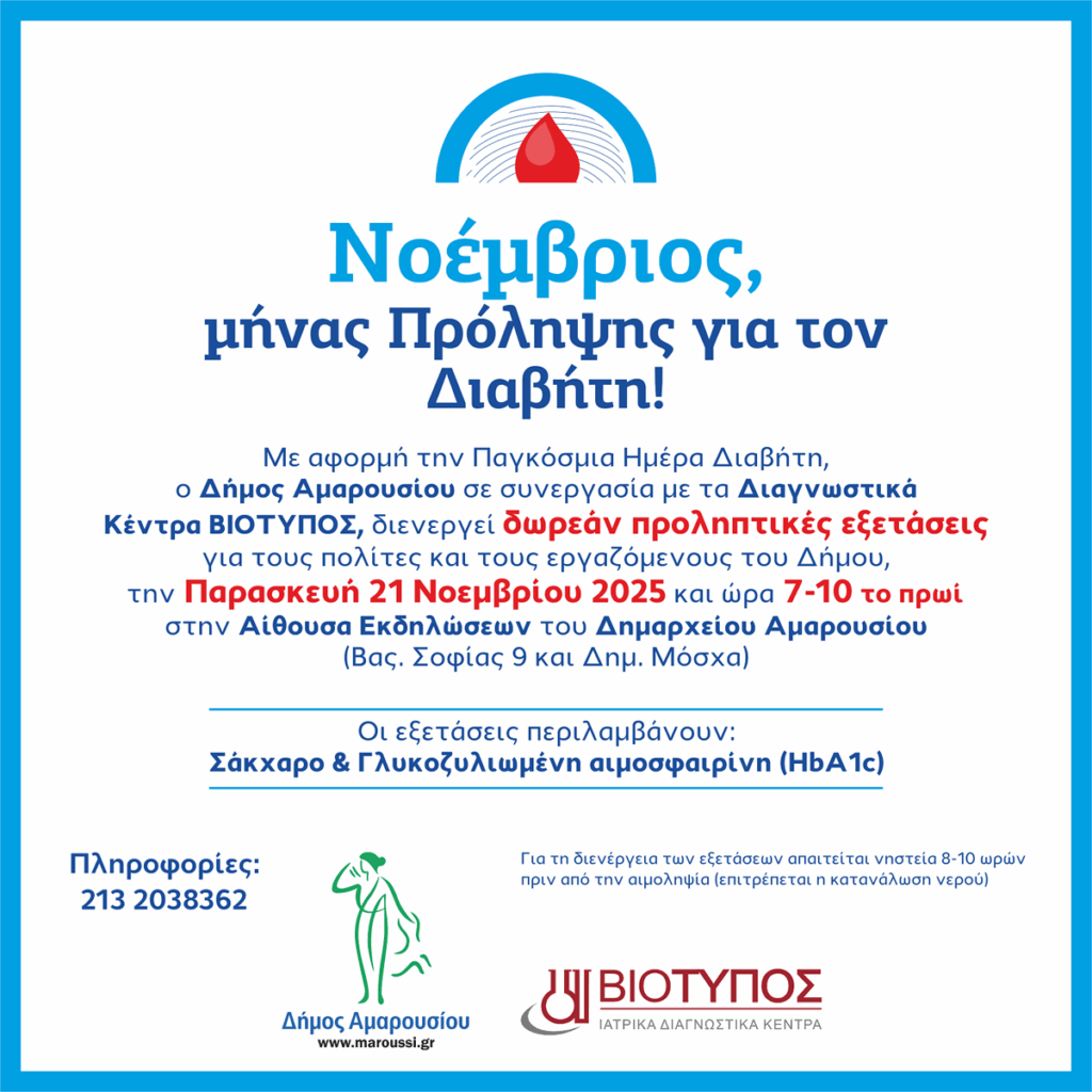 Την Παρασκευή 21 Νοεμβρίου, 7:00 με 10:00 το πρωί, θα πραγματοποιηθούν δωρεάν προληπτικές εξετάσεις σακχάρου και γλυκοζηλιωμένης στο Δημαρχείο Αμαρουσίου (Βας. Σοφίας 9 & Δημ. Μόσχα) με την ευγενική χορηγία των Διαγνωστικών Κέντρων ΒΙΟΤΥΠΟΣ.