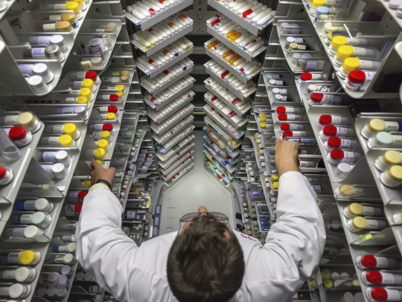 Photo of a pharmacist in a busy pharmacy, preparing a prescription with the help of automated dispensing equipment. The scene is shown from a view from bottom to top, focusing on the pharmacist’s precise work and the advanced equipment used for medication preparation. --chaos 13 --ar 4:3 Job ID: a2e63e94-2557-47ce-a4ea-88429d48966e