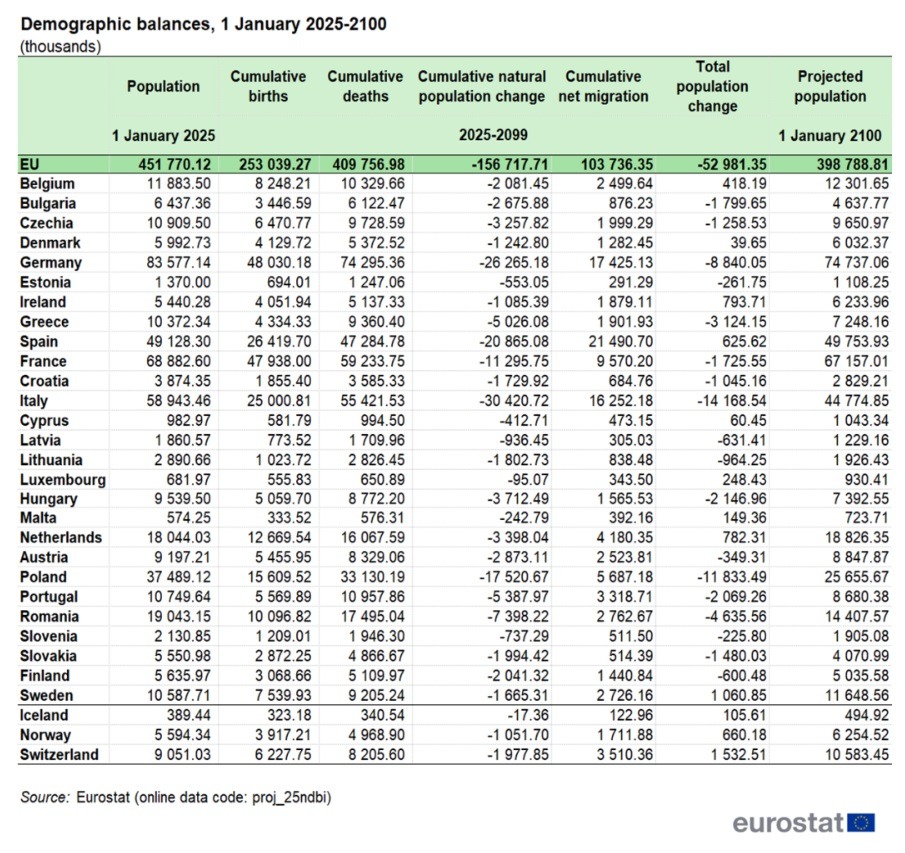 Σε ευρωπαϊκό επίπεδο, ο πληθυσμός της ΕΕ προβλέπεται να μειωθεί κατά 11,7% έως το τέλος του αιώνα. Από τα 451,8 εκατομμύρια το 2025, θα σημειώσει οριακή αύξηση έως το 2029 (453,3 εκατομμύρια), πριν ξεκινήσει μια σταθερή πτωτική πορεία που θα τον οδηγήσει στα 398,8 εκατομμύρια το 2100, δηλαδή κατά 53 εκατομμύρια λιγότερους κατοίκους.