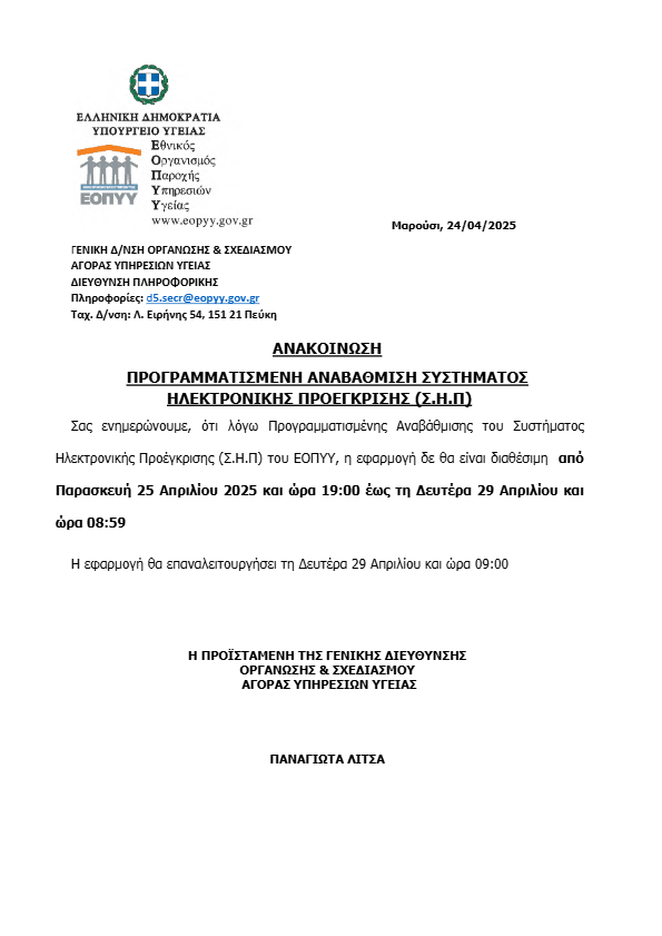 Με ανακοίνωση που εξέδωσε ο ΕΟΠΥΥ και υπογράφεται από την προϊσταμένη της Γενικής Διευθύνσεως Οργάνωσης και Σχεδιασμού Αγοράς Υπηρεσιών Υγείας κ. Π. Λίτσα, το σύστημα Ηλεκτρονικής Προέγκρισης (ΣΗΠ), θα βρίσκεται εκτός λειτουργείας λόγω αναβάθμισης, από τις 19:00 αύριο το απόγευμα μέχρι την Δευτέρα 29 Απριλίου, στις 8:59.