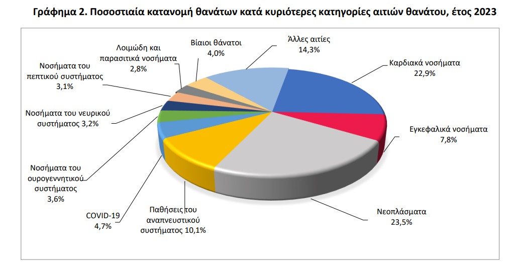 * Οι κυριότερες αιτίες θανάτου το 2023 ήταν τα νοσήματα του κυκλοφορικού συστήματος με 40.812 θανάτους. Ακολουθούν οι θάνατοι από νεοπλάσματα και οι θάνατοι που οφείλονται σε παθήσεις του αναπνευστικού συστήματος, που ανήλθαν σε 30.095 και 12.894, αντίστοιχα.