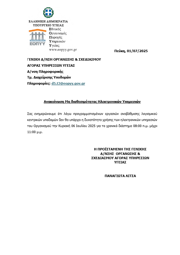 Σύμφωνα με ανακοίνωση του ΕΟΠΥΥ, την οποία υπογράφει η Προϊσταμένη της Γενικής Διεύθυνσης Οργάνωσης και Σχεδιασμού Αγοράς Υπηρεσιών Υγείας, Παναγιώτα Λίτσα, οι ηλεκτρονικές υπηρεσίες του Οργανισμού δεν θα λειτουργούν την Κυριακή 6 Ιουλίου, από τις 8:00 το πρωί έως τις 11:00 μ.μ., λόγω προγραμματισμένων εργασιών αναβάθμισης του λογισμικού των κεντρικών υπηρεσιών.