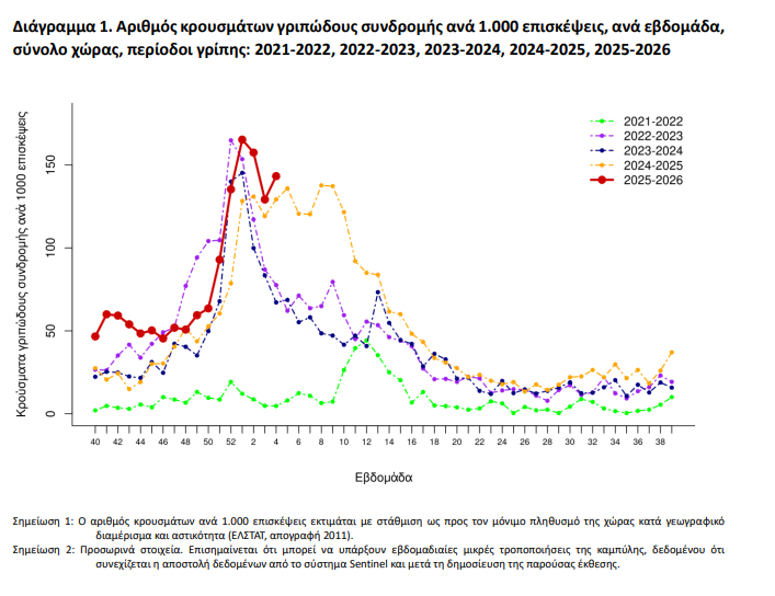 Ο δείκτης γριπώδους συνδρομής (ILI) —που αφορά το σύνολο των συμπτωμάτων που προσομοιάζουν με γρίπη— ανά 1.000 ιατρικές επισκέψεις, σημείωσε μικρή άνοδο σε σύγκριση με την προηγούμενη εβδομάδα. Η εξέλιξη αυτή υποδηλώνει μια σταθεροποίηση σε υψηλά επίπεδα, χωρίς ωστόσο να παρατηρηθεί υπέρβαση της κορύφωσης που είχε καταγραφεί την πρώτη εβδομάδα του έτους (01/2026).