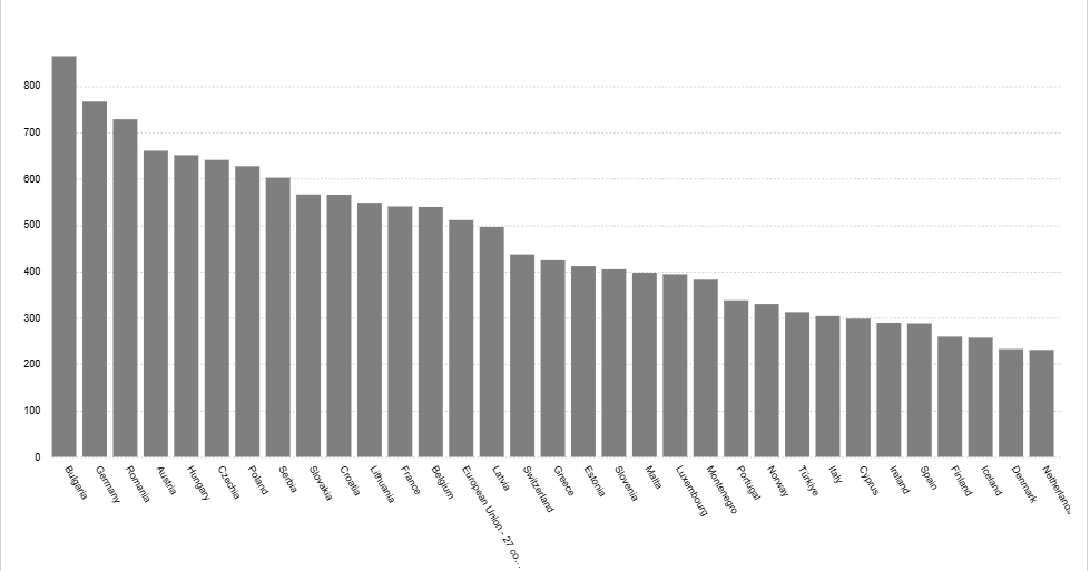 Η Βουλγαρία ήταν και το 2023, η πρώτη χώρα στην Ευρώπη με τον μεγαλύτερο αριθμό νοσοκομειακών κλινών ανά 100.000 ανθρώπους, σύμφωνα με τα στοιχεία που δημοσιοποίησε χθες η Eurostat.
