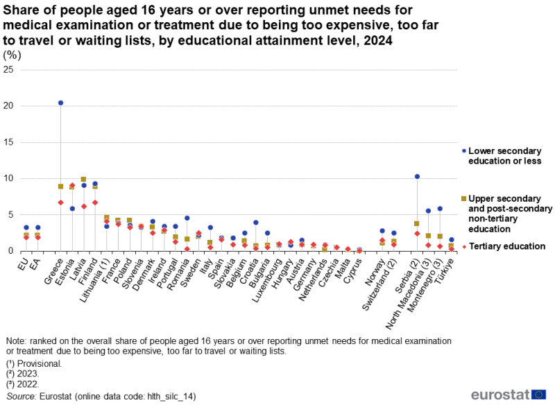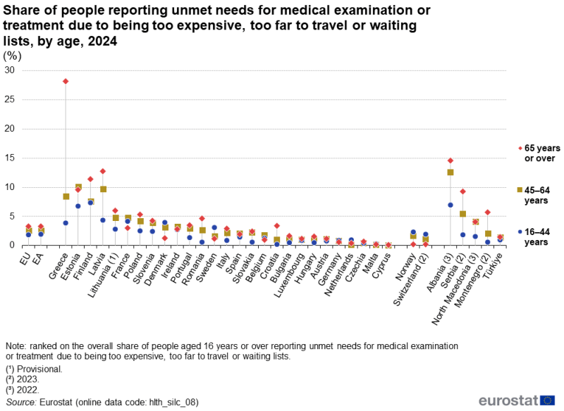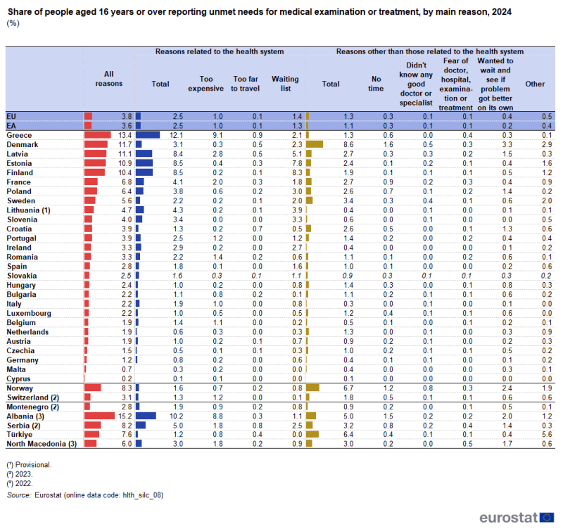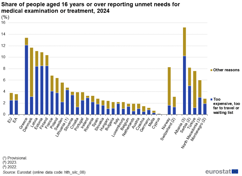 Το 2024, 3,8% των ατόμων ηλικίας 16 ετών και άνω στην ΕΕ δήλωσαν ότι είχαν ανικανοποίητες ανάγκες για ιατρική εξέταση ή θεραπεία. Το ποσοστό αυτό κυμάνθηκε από 0,2% στην Κύπρο και 0,7% στη Μάλτα έως και το υψηλότερο της Ένωσης, 13,4% στην Ελλάδα για όλο τον πληθυσμό και και 21.9% επί του πληθυσμού που χριάστηκε περίθαλψη, .