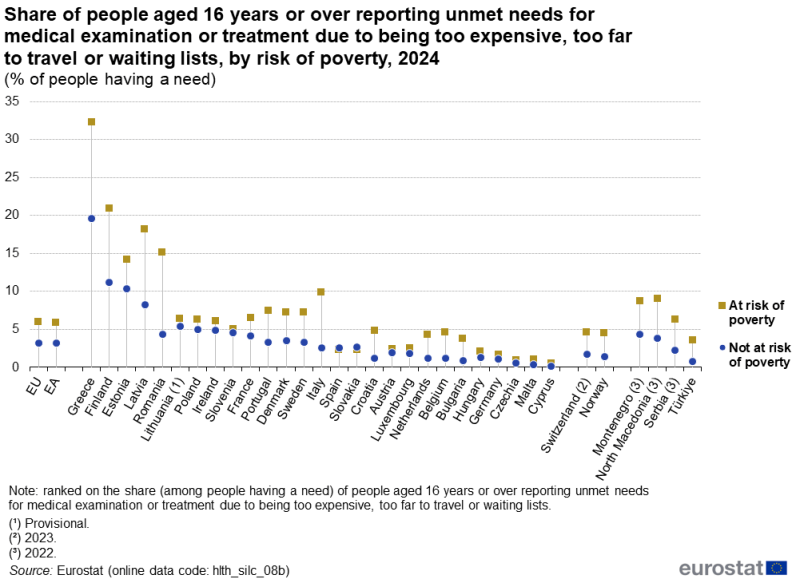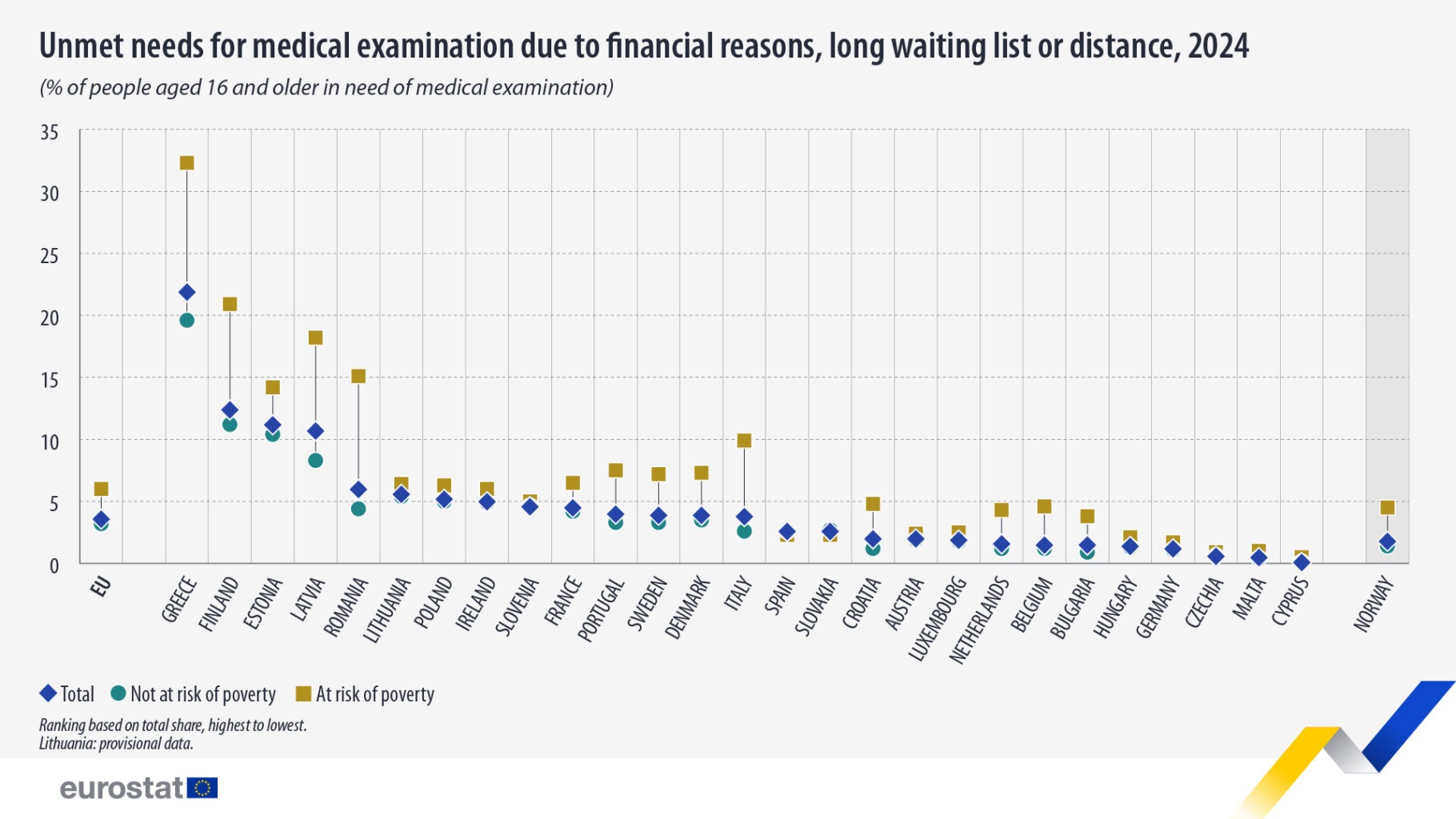 Η ανάλυση της Eurostat, η οποία δημοσιεύτηκε εχθές 20 Αυγούστου και αφορά στο 2024,, αποκαλύπτει ότι η Ελλάδα βρίσκεται στη χειρότερη θέση στην Ευρώπη ως προς τις ανικανοποίητες ανάγκες ιατρικής περίθαλψης. Οι λίστες αναμονής, το υψηλό κόστος, αλλά και οι κοινωνικές ανισότητες (εισόδημα, εκπαίδευση, φτώχεια) επιβαρύνουν δυσανάλογα τους πολίτες.