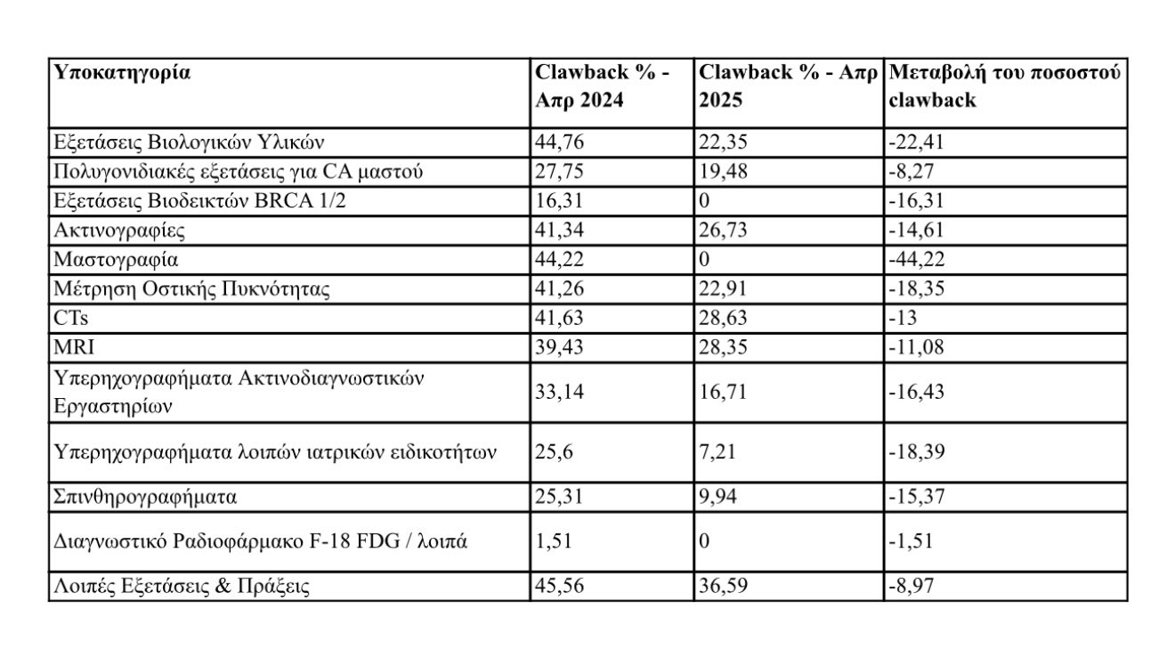 Από τα στοιχεία που δημοσιοποίησε με σχετικό πίνακα προκύπτει ότι μέσα σε ένα χρόνο το clawback για τις μαστογραφίες μηδενίστηκε (από 44,2% που ήταν το 2024). Η δεύτερη μεγαλύτερη πτώση αφορά στις εξετάσεις βιολογικών υλικών με πτώση 22,41% (από 44,76% το 2024 βρίσκεται πλέον στο 22,35%).