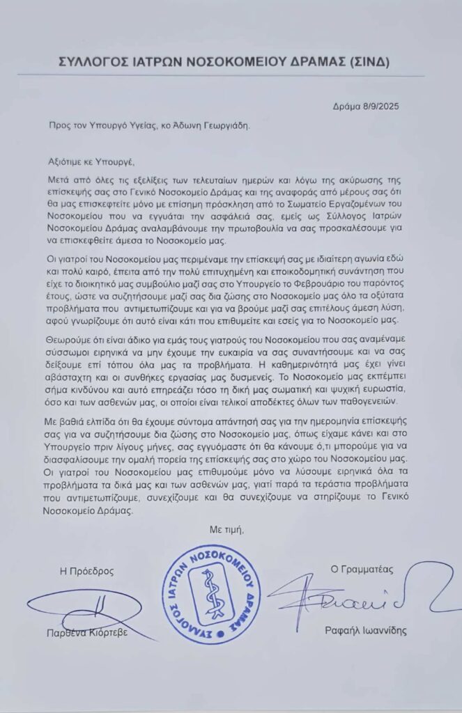 Μετά από όλες τις εξελίξεις των τελευταίων ημερών και λόγω της ακύρωσης της επίσκεψής σας στο Γενικό Νοσοκομείο Δράμας και της αναφοράς από μέρους σας ότι θα μας επισκεφθείτε μόνο με επίσημη πρόσκληση από το Σωματείο Εργαζομένων του Νοσοκομείου που να εγγυάται την ασφάλειά σας, εμείς, ως Σύλλογος Ιατρών Νοσοκομείου Δράμας, αναλαμβάνουμε την πρωτοβουλία να σας προσκαλέσουμε να επισκεφθείτε άμεσα το Νοσοκομείο μας.