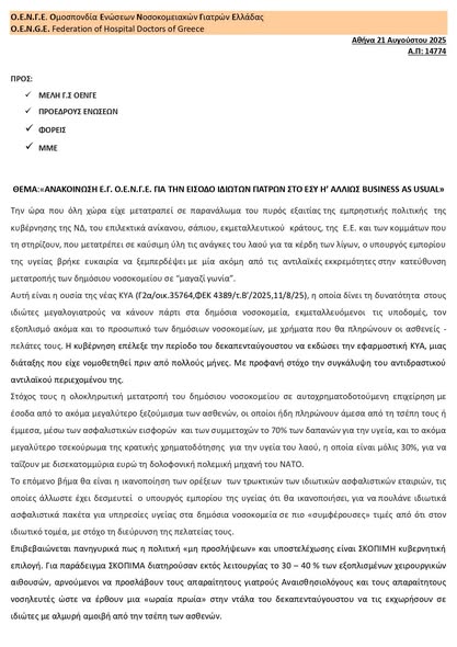 Η Ομοσπονδία Ενώσεων Νοσοκομειακών Γιατρών Ελλάδος (ΟΕΝΓΕ) ασκεί δριμεία κριτική  στο Υπουργείου Υγείας και τον Άδωνι Γεωργιάδη σχετικά με τη νέα Κοινή Υπουργική Απόφαση (ΚΥΑ), που επιτρέπει τη συνεργασία ιδιωτών γιατρών με τα δημόσια νοσοκομεία του ΕΣΥ. Στην ανακοίνωσή της Η ΟΕΝΓΕ επισημαίνει ότι η πολιτική αυτή μετατρέπει τα δημόσια νοσοκομεία σε επιχειρηματικές μονάδες, εκμεταλλεύεται υποδομές, προσωπικό και εξοπλισμό για ιδιωτικά κέρδη, υπονομεύει τη χρηματοδότηση της δημόσιας υγείας και επιβεβαιώνει την επιλογή υποστελέχωσης ως στρατηγική της κυβέρνησης, επιβαρύνοντας τους πολίτες με άμεσες και έμμεσες δαπάνες για την περίθαλψή τους.