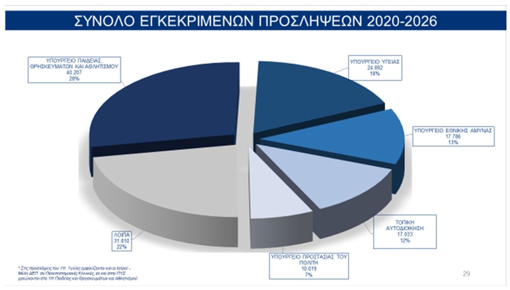 Από το σύνολο των 141.692 εγκεκριμένων προσλήψεων την περίοδο 2020 – 2026, πάνω από 25.000 αφορούν την Υγεία. Συγκεκριμένα, οι προσλήψεις την περίοδο διακυβέρνησης της ΝΔ αφορούν: