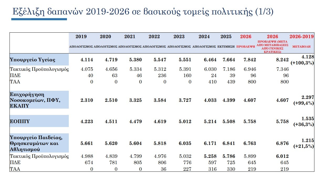«Η επιχορήγηση των νοσοκομείων έχει επίσης διπλασιαστεί από 2,3 δισ. ευρώ σε 4,6 δισ. ευρώ, με αύξηση 200 εκατ. ευρώ από το 2025 στο 2026. Σημαντική αύξηση έχουμε και στη φαρμακευτική δαπάνη με την επιχορήγηση του ΕΟΠΠΥ να διαμορφώνεται στα 5,75 δισ. ευρώ το 2026, αυξημένη κατά 250 εκατ. ευρώ σε σχέση με το 2025 και κατά 1,5 δισ. ευρώ σε σχέση με το 2019» ανέφερε επίσης ο κ. Πετράλιάς.
