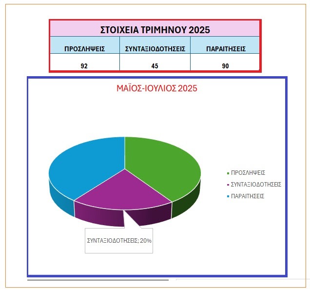 Στον συνημμένο πίνακα φαίνεται η κατάσταση τους μήνες Μάιο έως και Ιούλιο του 2025, όπου δυστυχώς όσοι προσλαμβάνονται στο ΕΣΥ είναι λιγότεροι από το άθροισμα όσων παραιτούνται και συνταξιοδοτούνται. Και επιπλέον το ισοζύγιο το 2025 είναι χειρότερο από το 2024 πριν τη λήψη των μέτρων.