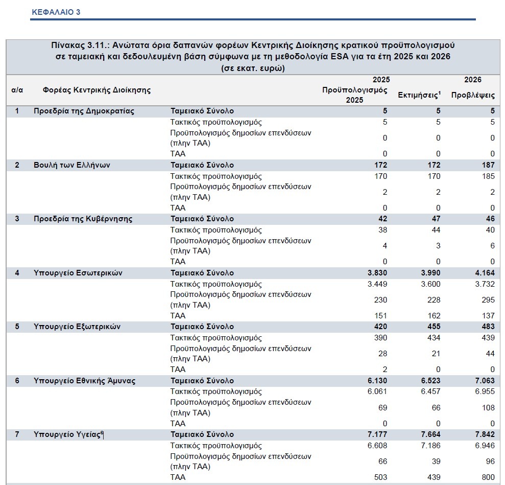 Ο τακτικός προϋπολογισμός έτους 2025 είχε προβλεφθεί σε 6.608 εκατ. ευρώ, ενώ κατά τη διάρκεια εκτέλεσης ενισχύθηκε κατά 578 εκατ. ευρώ και διαμορφώθηκε στο ποσό των 7.186 εκατ. ευρώ.