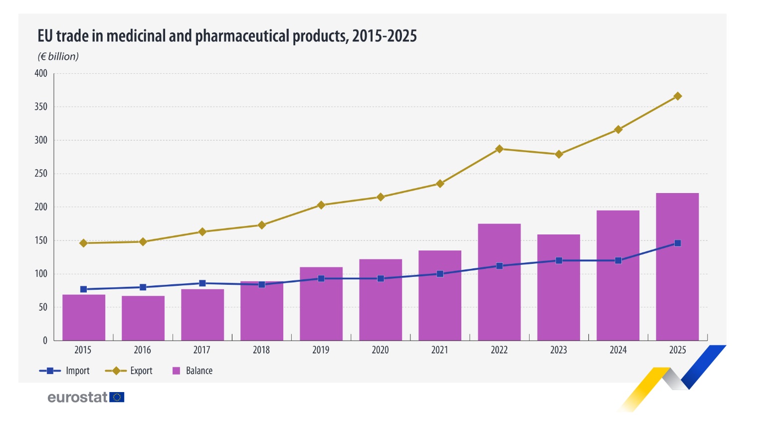 Σύμφωνα με τα στοιχεία της Eurostat, η ΕΕ εξήγαγε φάρμακα συνολικής αξίας 366,2 δισ. ευρώ, ενώ οι εισαγωγές διαμορφώθηκαν στα 145,7 δισ. ευρώ. Το αποτέλεσμα ήταν ένα εμπορικό πλεόνασμα ύψους 220,5 δισ. ευρώ – το υψηλότερο που έχει καταγραφεί έως σήμερα.