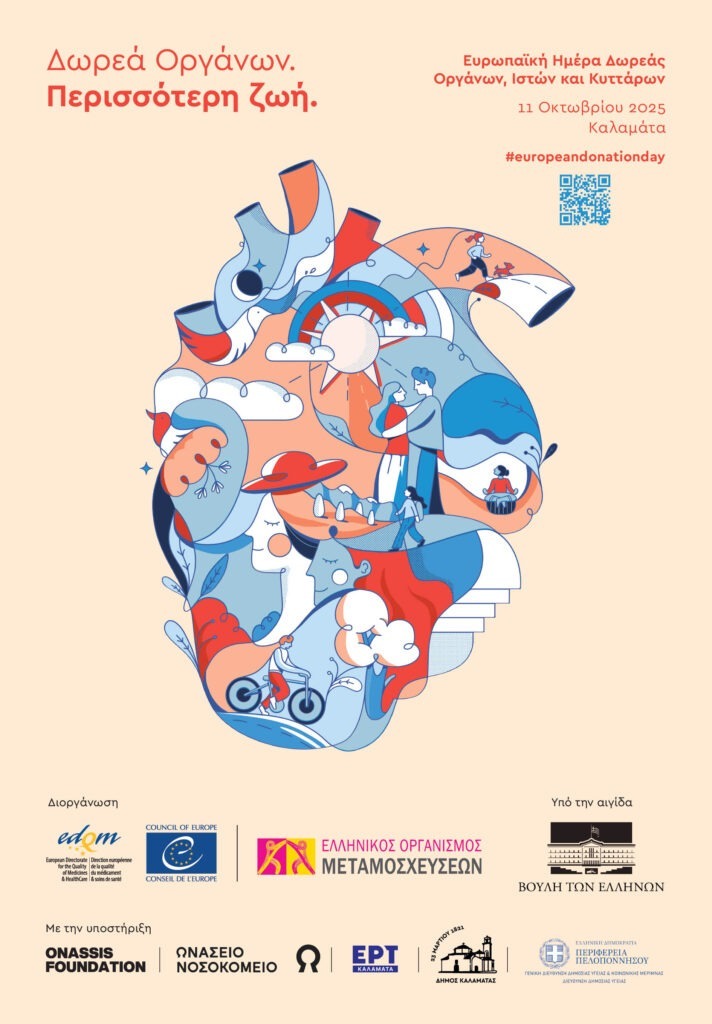 Το Σάββατο 11 Οκτωβρίου του 2025, η Ελλάδα έχει την τιμή να φιλοξενεί στην Καλαμάτα την «Ευρωπαϊκή Ημέρα Δωρεάς Οργάνων, Ιστών και Κυττάρων», υπό την αιγίδα της Βουλής των Ελλήνων. Με το μήνυμα «Δωρεά Οργάνων, Περισσότερη Ζωή», το δώρο ζωής από άνθρωπο σε άνθρωπο, μπαίνει στο επίκεντρο του δημόσιου διαλόγου. Με συμβολικές δράσεις σε όλη τη χώρα, αλλά και με τις εκδηλώσεις, που διοργανώνει κάθε ευρωπαϊκή χώρα την ημέρα αυτή, το σημαντικό μήνυμα θα μεταδοθεί, με σκοπό τη δημιουργία περισσότερων ευκαιριών ζωής για κάθε Ευρωπαίο πολίτη.