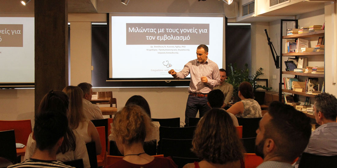 Ο Βασίλης Κιοσσές (Ψυχολόγος PhD,  Empathize with me doctor) ανέφερε πως τόσο οι γιατροί, όσο και οι γονείς έχουν ως κοινή συνισταμένη τη διασφάλιση της υγείας των παιδιών. Η διαφορά έγκειται στο γεγονός πως ορισμένοι γονείς παίρνουν αποφάσεις από την καρδιά. Και εκεί ακριβώς πρέπει να στοχεύει η συμβουλευτική που κάνουν οι επαγγελματίες γύρω από τον εμβολιασμό. Κανένα επιχείρημα δεν μπορεί να λειτουργήσει εάν δεν υπάρχει μια σχέση εμπιστοσύνης μεταξύ των δύο. Εάν ο γονιός δεν αισθάνεται το γιατρό ως μέρος του υποστηρικτικού του δικτύου, εάν δεν αισθάνεται πως η ανησυχία του ακούγεται, εάν δεν αισθάνεται πως ο επαγγελματίας επικυρώνει τα συναισθήματά του και δεν τα απαξιώνει, τότε ο διάλογος δεν μπορεί να έχει αποτέλεσμα. Η ημερίδα «Ενσυναισθάνομαι- Εμβολιάζω» ήταν μία καλή αρχή προς αυτή την κατεύθυνση.