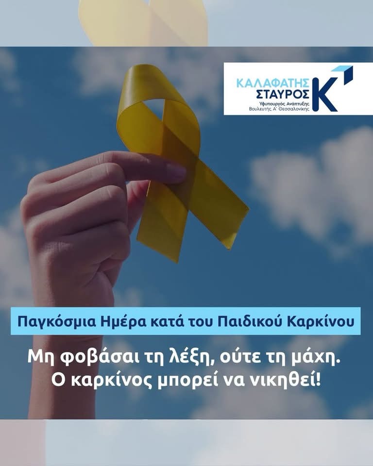 Την ανάγκη συλλογικής δράσης και αλληλεγγύης προς τα παιδιά με νεοπλασματικές ασθένειες και τις οικογένειές τους, υπογραμμίζει σε μήνυμά του για την Παγκόσμια Ημέρα κατά του Παιδικού Καρκίνου, ο υφυπουργός Ανάπτυξης Σταύρος Καλαφάτης τονίζοντας ότι η πρόληψη και η έγκαιρη διάγνωση μπορούν να σώσουν ζωές.