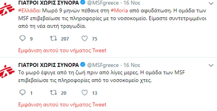 Ο θάνατος τού βρέφους, που έμενε στον καταυλισμό με τους γονείς του, οι οποίοι έχουν κάνει αίτηση ασύλου, γνωστοποιήθηκε χθες το βράδυ με ανάρτηση σε μέσο κοινωνικής δικτύωσης από την οργάνωση «Γιατροί Χωρίς Σύνορα».
