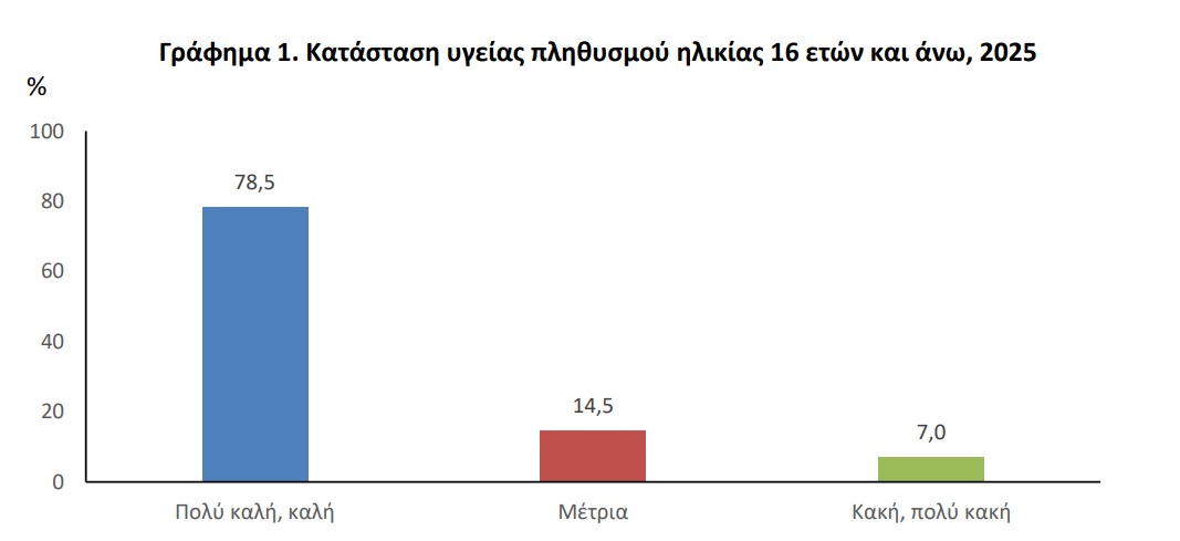 Σύμφωνα με τα αποτελέσματα της έρευνας, το 7,0% του πληθυσμού ηλικίας 16 ετών και άνω δήλωσε ότι έχει πολύ κακή ή κακή υγεία, το 14,5% μέτρια, ενώ το 78,5% πολύ καλή ή καλή υγεία.