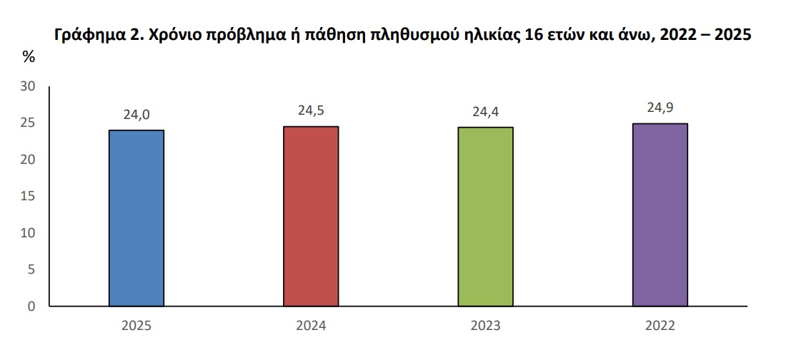Το 24,0% του πληθυσμού ηλικίας 16 ετών και άνω έχει χρόνιο πρόβλημα υγείας. Χρόνιο πρόβλημα ή χρόνια πάθηση δηλώνουν περίπου 1 στις 4 γυναίκες (26,5%) και 1 στους 5 άνδρες (21,4%). Χρόνιο θεωρείται το πρόβλημα υγείας ή η πάθηση που διαρκεί ή πρόκειται να διαρκέσει περισσότερους