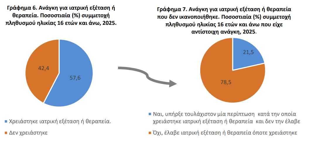 Κατά τους τελευταίους 12 μήνες πριν από τη διενέργεια της έρευνας, περίπου 6 στα 10 άτομα (57,6%) ηλικίας 16 ετών και άνω χρειάστηκε ιατρική εξέταση ή θεραπεία. Από αυτούς που χρειάστηκαν ιατρική εξέταση ή θεραπεία, το 21,5% δεν την έλαβε κάθε φορά που χρειάστηκε.