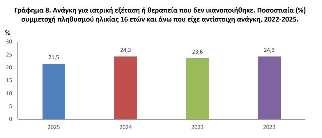 Ωστόσο, το συγκεκριμένο ποσοστό εμφανίζει υποχώρηση σε σχέση με τα προηγούμενα χρόνια, καθώς είχε διαμορφωθεί στο 24,3% το 2022, στο 23,6% το 2023 και ξανά στο 24,3% το 2024, καταγράφοντας το 2025 μια αισθητή μείωση. Η εξέλιξη αυτή δείχνει μια σχετική βελτίωση στην πρόσβαση, χωρίς όμως να αναιρεί το μέγεθος του προβλήματος.