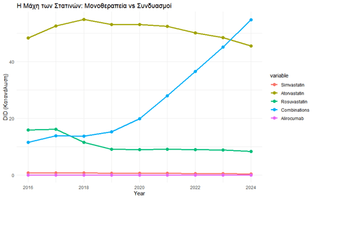 Επίσης ένα άλλο εύρημα είναι πως υπάρχει μία ραγδαία αύξηση των σταθερών συνδυασμών που συνδυάζουν την λήψη δυο δραστικών ουσιών σε ένα χάπι ( συνήθως μια στατίνη μαζί με εζετιμίμπη). Η χρήση τους πενταπλασιάστηκε (+363%) από το 2016 με κυριότερο οδηγό τον συνδυασμό εζετιμίμπης/ροσουβαστατίνης που αυξήθηκε σε κατανάλωση 97 φορές από το 2019 μέχρι το 2024. Πρόκειται για «μια σημαντικότατη και ευεργετική εξέλιξη για των καθημερινότητα των ασθενών», όπως αναφέρεται στη μελέτη.