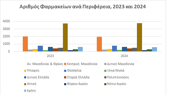 Σε ό,τι αφορά τα στοιχεία για τα φαρμακεία σε λειτουργία και τους απασχολούμενους σε αυτά φαρμακοποιούς το 2024 λειτούργησαν 10.456 φαρμακεία στο σύνολο της Χώρας, εκ των οποίων 3.755 (35,9%) στην Περιφέρεια Αττικής. Ο αριθμός των φαρμακείων παρουσίασε μείωση κατά 0,4% σε σχέση με το 2023. Η μεγαλύτερη αύξηση (0,7%) παρατηρήθηκε στην Περιφέρεια Νοτίου Αιγαίου με 2 νέα φαρμακεία, ενώ η μεγαλύτερη μείωση (2,4%) στην Περιφέρεια Κεντρικής Μακεδονίας με 48 λιγότερα φαρμακεία (δες παρακάτω πίνακα).