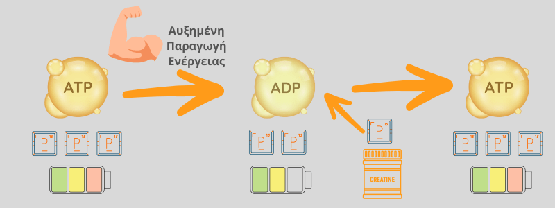 Εδώ είναι που έρχεται ο ρόλος της κρεατίνης: Η φωσφοκρεατίνη λειτουργεί ως “αποθήκη” φωσφορικών ομάδων. Όταν το ATP εξαντλείται γρήγορα (π.χ., κατά τη διάρκεια ενός σπριντ ή μιας άρσης βαρών), η φωσφοκρεατίνη δωρίζει τη φωσφορική της ομάδα στο ADP, αναγεννώντας γρήγορα το ATP.