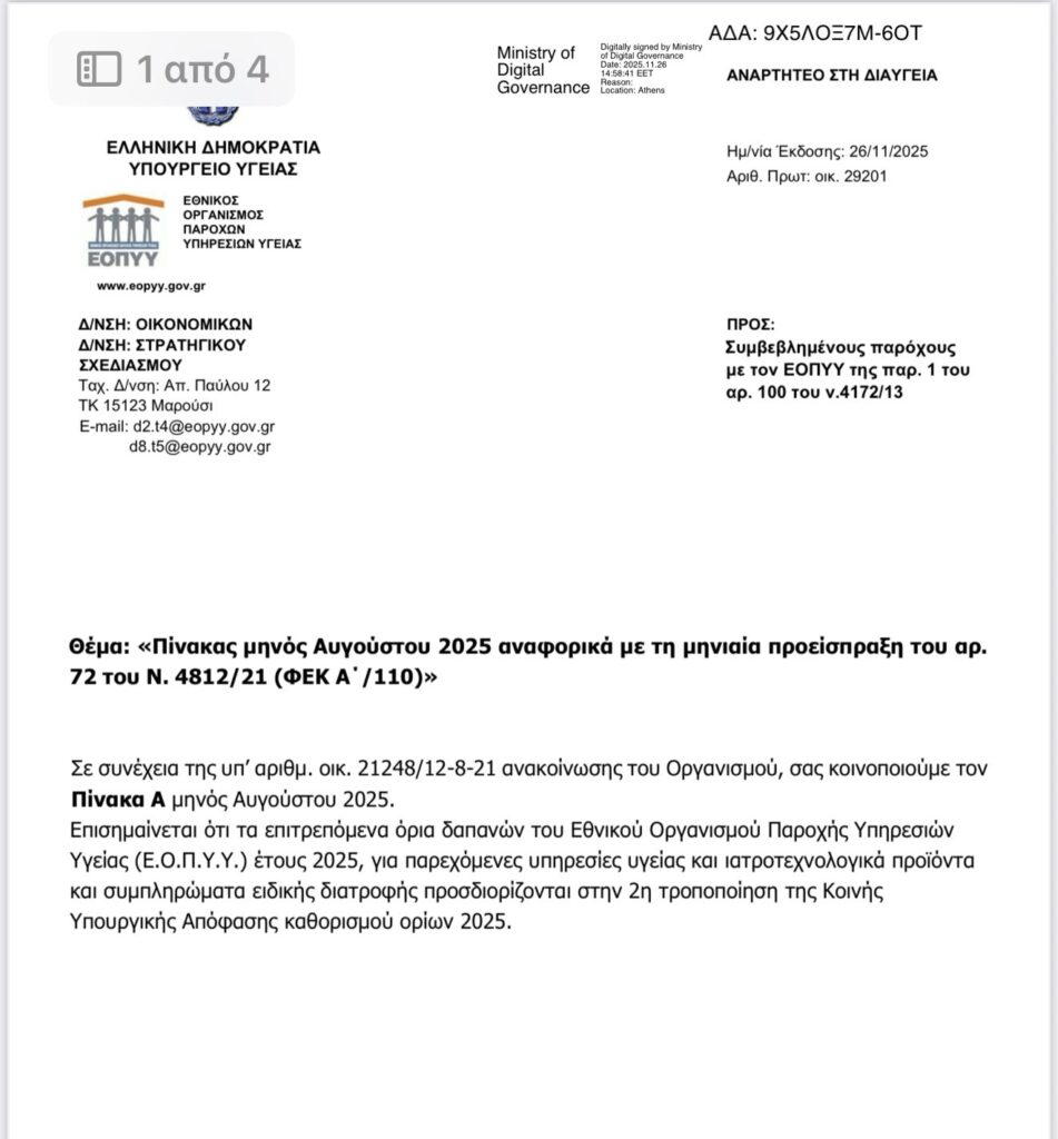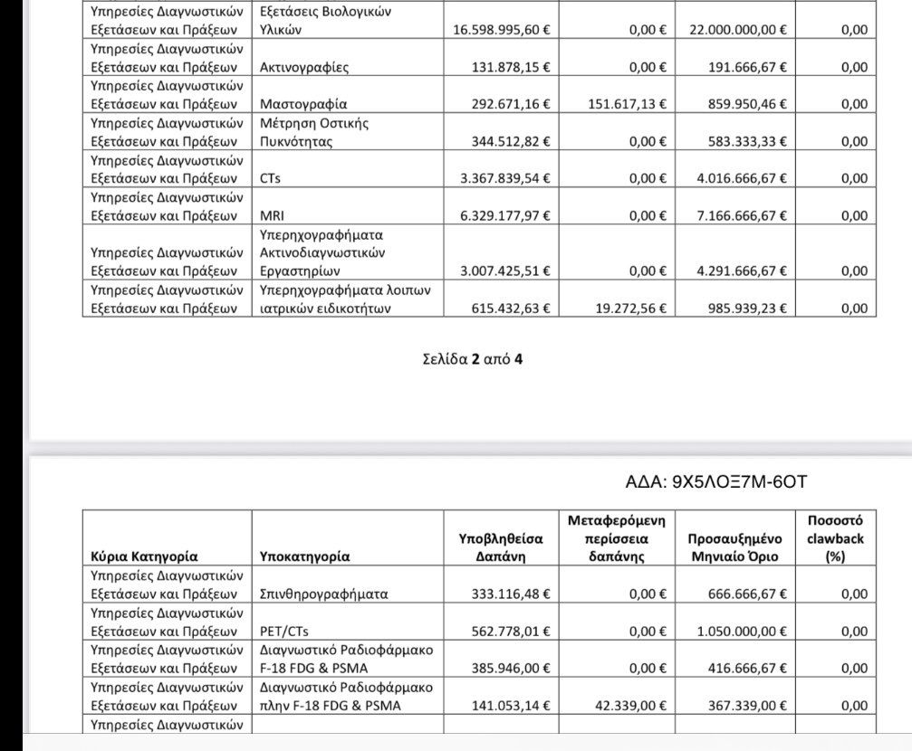 «Σήμερα δημοσιεύθηκαν τα αποτελέσματα του Αυγούστου 2025, τα οποία επιβεβαιώνουν μία από τις σημαντικότερες επιτυχίες στη συγκράτηση της δαπάνης για τις Υπηρεσίες Διαγνωστικών Εξετάσεων και Πράξεων. Το ποσοστό clawback διαμορφώθηκε στο 0% (μηδέν) σχεδόν σε όλες τις υποκατηγορίες, αποτυπώνοντας με τον πιο καθαρό τρόπο την ουσιαστική βελτίωση στη λειτουργία της αγοράς.