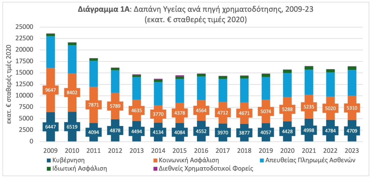 Στα νοσοκομεία του ΕΣΥ το 2023 η χρηματοδότηση παραμένει κατά 38% μικρότερη, σε σχέση με τα προ-κρίσεων επίπεδα του 2009, η αθροιστική απώλεια δημόσιας χρηματοδότησης στα νοσοκομεία την τελευταία 15ετία αγγίζει το ποσό των €37δισ. και το υγειονομικό προσωπικό στα νοσοκομεία του ΕΣΥ το 2024 παρέμενε κατά 9,6% λιγότερο σε σχέση με το 2009.