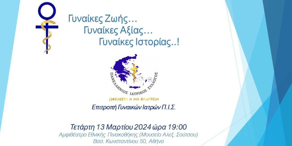 Με αφορμή την Παγκόσμια Ημέρα Γυναίκας, η Επιτροπή Γυναικών Ιατρών του Πανελλήνιου Ιατρικού Συλλόγου διοργανώνει την Τετάρτη 13 Μαρτίου το απόγευμα 19:00- 21:00 στο αμφιθέατρο της Εθνικής Πινακοθήκης εκδήλωση με θέμα «Γυναίκες Ζωής, Γυναίκες Αξίας, Γυναίκες Ιστορίας».